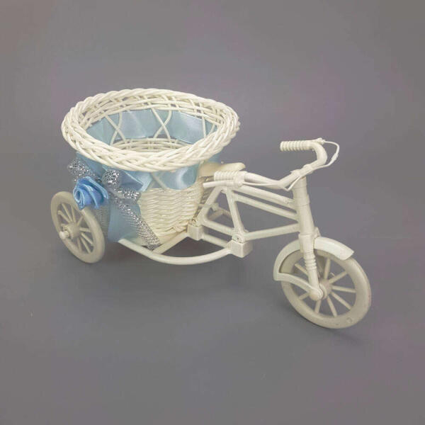 Virágtartó műanyag tricikli, műanyag fonott kosárral, selyem szalaggal, közepes méretű növényekhez. Rendkívül egyszerűen dekorálhatjuk masnival, gyöngyökkel, szatén szalaggal. Kültéren és lakásban is elhelyezhető.