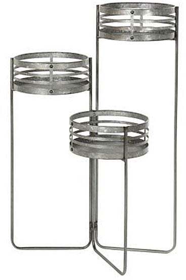 Minőségi kivitelezésű szürke színű, gyönyörű hántolt felületű kerek formájú, 3 részes fém kaspó lábakkal. A szürke színű lábakon álló 3 részes fém kaspó mérete: 47x35x72cm.