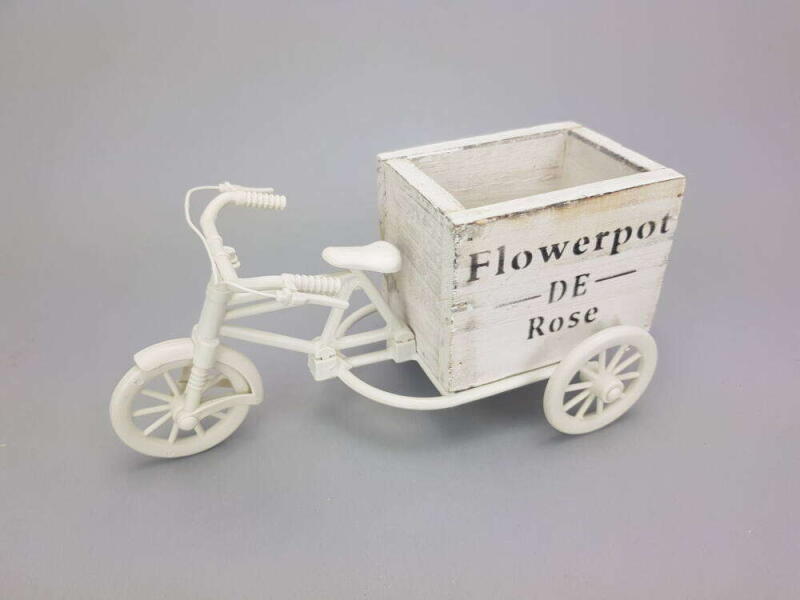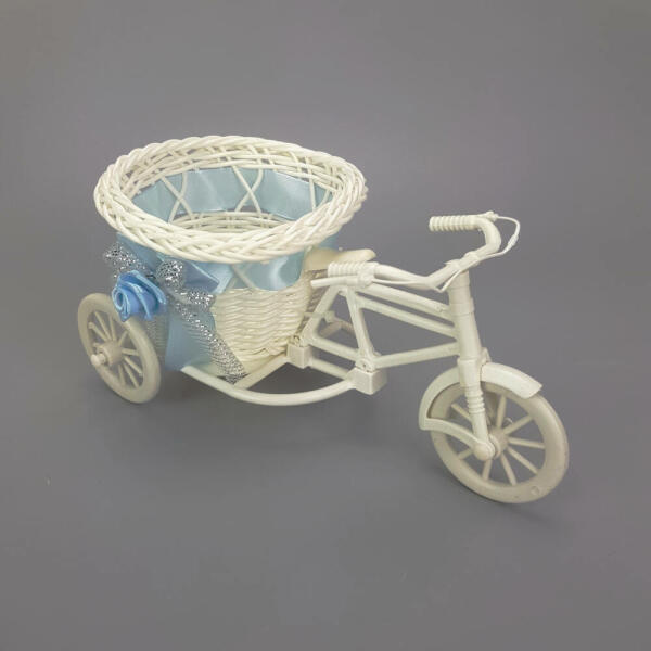 Virágtartó műanyag tricikli, műanyag fonott kosárral, selyem szalaggal, közepes méretű növényekhez. Rendkívül egyszerűen dekorálhatjuk masnival, gyöngyökkel, szatén szalaggal. Kültéren és lakásban is elhelyezhető.