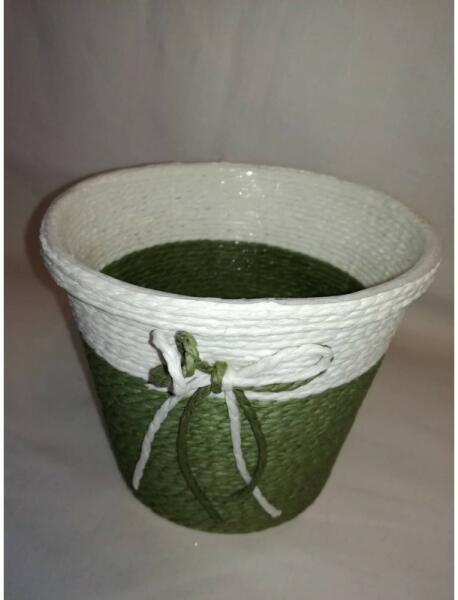 15 cm átmérőjű, 12,5 cm magas, fehér és zöld színű kötéllel körbetekert műanyag kaspó.