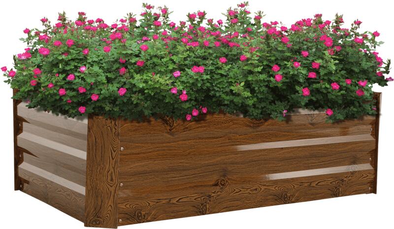 Virágágy anyaga: acél/alumínium Szín: barna/mintás fa Külső méretek (SzxMéxMa): 120x60x30 cm Belső méretek (SzxMéxMa): 118,5x58,5x30 cm Anyagvastagság: 0,3 mm, sarok 0,8 mm Alkalmas bentre és kintre Könnyű összeszerelés Acél porszórt felületkezeléssel Gyógynövényekhez, virágokhoz vagy zöldségekhez Különböző igényű növényekhez Nagyobb védelem a csigák ellen Ki