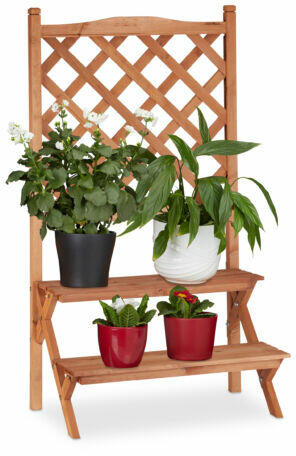 AMINA Fa Virágtartó és Rózsafuttató "L" 2 lépcsős fából készült virágtartó állvány Rácsos hátlap, amelyre akár futónövények is felfuttathatóak Teljes mérete: 109,5 x 61 x 40 cm (Ma x Szé x Mé) Virágtartó lépcső mérete: 60 x 20 cm (Szé x Mé) Maximális terhelhetősége: max. 40 kg Anyaga: Fenyő Súly: 2,8 kg