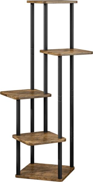 Anyag: fém/faforgácslap Szín: fekete/rusztikus fa Méretek (SzxMéxMa): 30x30x106,5 cm Állványként cserepes növényekhez 5 polc Teherbírás/polc: 5 kg Fém szerkezet Rúd vastagsága: 1,6 cm Magasság az 1. és a 2. polc között: 27,4 cm Magasság az 1. és a 3. polc között: 54 cm Magasság az 1. és a 4. polc között: 80 cm Modern stílus Szétszerelve szállítva