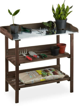 DARDOK Fa Palántázó asztal Dekoratív, modern palántázó asztal Fémlemez a felső polcon Kényelmes magasságban végezhetőek el az ültetéssel kapcsolatos feladatok Alsó polcain az ültetéshez szükséges kellékek tárolhatóak, így a virágföld, a kerti szerszámok és cserepek egy helyen tárolhatóakTeljes Mérete: 86 x 92 x 42 cm (Ma x Szé x Mé) Munkalap szegéllyel: 8 x 92 x 4
