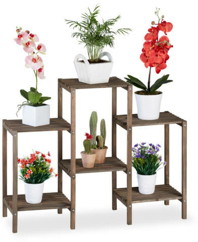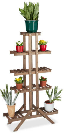 GUNDA Fa Virágtartó 5 Szintes, dekoratív virágtartó, beltéri vagy fedett helyen történő használatra. Teljes Mérete: 142,5 x 83 x 28,5 cm (Ma x Szé x Mé) Felső és alsó polcok mérete: 25 x 25 cm (Szé x Mé) Középső polcok mérete: 22 x 25 cm (Szé x Mé)Polconkénti maximális terhelhetőség 15 kg. Súlya: kb. 4,1 kg Színe: Csokibarna Anyaga: Fenyő