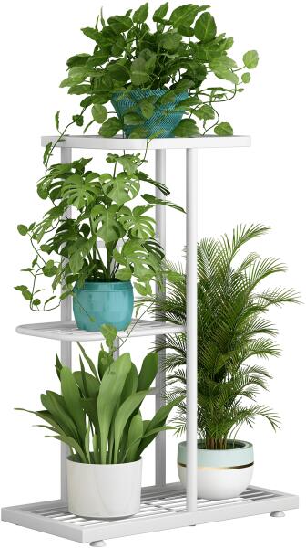 Anyag: fém Szín: fehér Méretek (SzxMéxMa): 41x22x57,5 cm Teherbírás/polc: 2 kg Rúd vastagsága: 1,6 cm Második polc méretei (SzxMé): 22,5x18,5 cm Harmadik polc méretei (SzxMé): 24x21,5 cm Polcok közötti magasság: 26/27 cm Fém szerkezet 3 polc Modern stílus Állványként cserepes növényekhez A lábak rugalmas végekkel vannak ellátva a felület kiegyenlítésére Szétszerelve