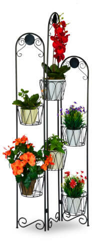 DÁLIA Fém Virágállvány, Paraván Virágállvány, 6 virágtartó kosárral. Terhelhetősége Kosaranként max. 5 kg Beltéri és kültéri használatra is alkalmas. Teljes magassága: 140 cm Egy elem szélessége: 25 cm Összecsukott mérete: 140 x 21 x 17,5 cm (Ma x Szé x Mé) Kosarak átmérője: (felső) 17 cm , (alsó) 13 cm Anyaga: Porszórt fém Szín: Fekete Súly: 3,4 kg