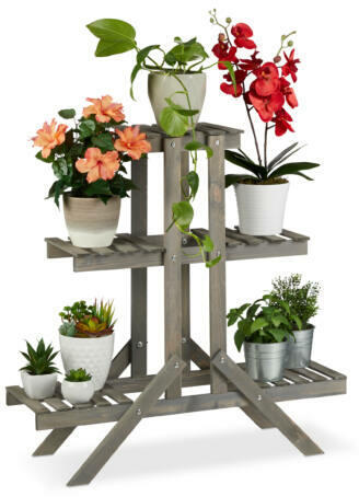 GÖRAN Fa Virágtartó 3 Szintes, dekoratív virágtartó, beltéri vagy fedett helyen történő használatra. Kopott, antikolt hatású lakkozás. Teljes mérete: 83 x 83 x 28 cm (Ma x Szé x Mé) Felső és alsó polcok mérete: 25 x 25 cm (Szé x Mé) Középső polcok mérete: 22 x 25 cm (Szé x Mé) Polconkénti maximális terhelhetőség: 15 kg Anyaga: Fenyő Súlya: kb. 2,5 kg Szín: Szür