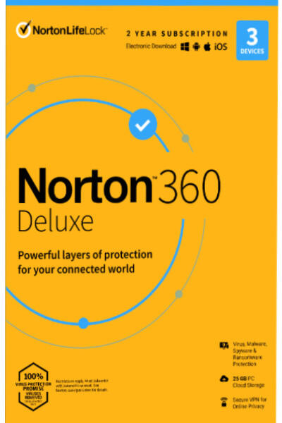 A Norton 360 Deluxe 3 PC, Mac®-gép, okostelefon vagy táblagép védelmét biztosítja. Kémprogramok, vírusok, kártevő programok és zsarolóprogramok elleni védelem 25GB felhőalapú biztonsági mentés PC-hez (A Norton Felhőalapú biztonsági mentés funkciói csak Windows operációs rendszerben érhetők el) Tűzfal Pc-hez és Mac-géphez Jelszókezelő 100%-os Vírusvédelem ígéret