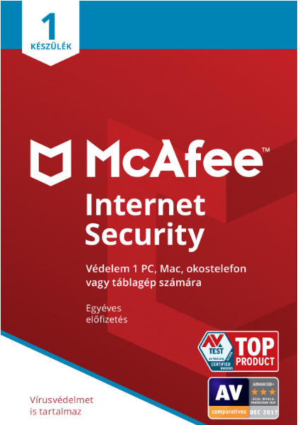 Termékleírás: McAfee® Internet SecurityMegbízható víruskereső és online védelem akár 1 eszközhöz: PC-k, Mac-ek, okostelefonok és táblagépek egyetlen előfizetéssel AMcAfee® Internet Security digitális védelemmel nyújt nyugalmat a fogyasztók számára szerte a világon, beleértve a díjnyertes antivírus-védelmet a PC-k és a Mac-ek számára és mobil eszközök. Gyors tele