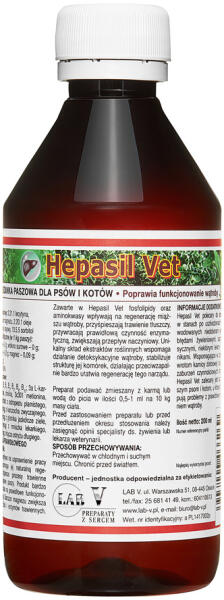Hepasil Vet kutyáknak és macskáknak - cél Támogatja a máj regenerálódását, Gyorsítja az emésztési folyamatokat, Javítja a táplálékfelvételt. Hepasil Vet kutyáknak és macskáknak - Tartalomjegyzék Takarmány-alapanyagok: Nyers lecitin, Magnézium-szulfát-szevidrát, Növényi olajok: lenmag és szója, Szorbit. Analitikai összetevők (1 kg takarmányban): Nyersfehérje - 0 g,