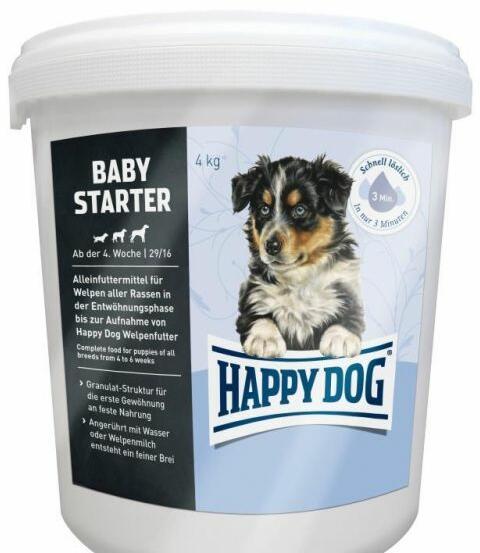 A Happy Dog Baby Starter egy kiváló minőségű komplett granulátum eledel kölyökkutyáknak az elválasztás fázisban. Kiváló minőségű baromfit és lazacot, valamint értékes új-zélandi kagylót tartalmaz. Alkalmas az anyatejről való probléma mentes és kímélő elválasztásra. – keverjük össze vízzel vagy kutyatejjel és vékony kását kapunk. – finomszemcsés struktúr