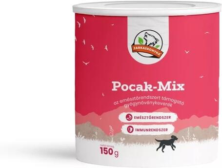 150g Farkaskonyha Pocak-Mix az emésztőrendszert támogató gyógynövénykeverék. Érzékeny emésztés, étrendváltás, környezetváltozás, utazás alkalmával, valamint féreghajtás és gyógyszeres kezelések után támogatást igénylő emésztőrendszer esetén ajánlott gyógynövénymix kutyáknak.