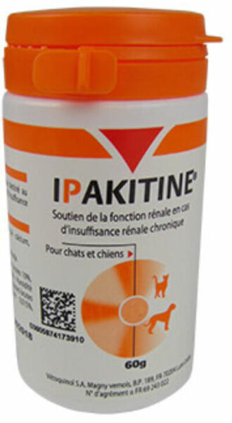 Az Ipakitine macskák és kutyák foszfor-, ammónia (urea, kreatinin)-és koleszterin-terhelésének csökkentésére szolgáló diétás táplálékkiegészítő. Adagolása : Egy mérőkanálnyi por (1g)/5ttkg adagolandó a táplálékba, naponta kétszer. legalább 6 hónapon keresztül folyamatosan. Összetétel : Laktóz, kalcium-karbonát, szója hidrolizátum, chitosan Beltartalom : Nyersh