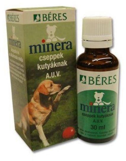 Béres csepp kutyáknak. A Béres- és a Minera cseppek ásványi anyagokat és nyomelemeket tartalmazó, gyógyszerként törzskönyvezett gyógyhatású készítmények. Immunerősítő, roboráló, egészségvédő. 1. A GYÓGYHATÁSÚ KÉSZÍTMÉNY NEVE Minera cseppek kutyáknak 2. TERMÉKFORMA Belsőleges oldat 3. HATÓANYAGOK ÉS EGYÉB ÖSSZETEVŐK MEGNEVEZÉSE: 1 ml (19 csepp) oldat tartal
