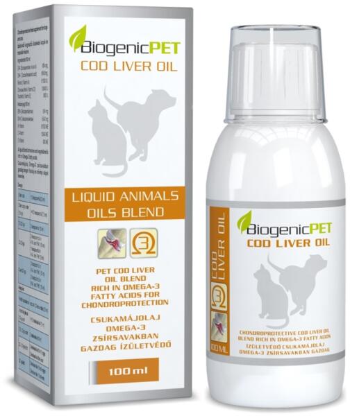 Biogenicpet csukamájolaj kutyáknak és macskáknak egy ízületvédő kiegészítő állateledel. EPA és DHA zsírsavakban és vitaminokban gazdag olaj, mely segít igazán fényessé és egészségessé varázsolni a kutyusok bundáját és bőrét. Gyulladáscsökkentő és immunerősítő hatással rendelkezik. Támogatja az ízületeket és mozgásszervi rendszert. Az EPA egy telítetlen zs