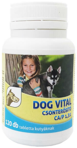 A DOG VITAL 1:1,3 CSONTERŐSÍTŐ tabletta ásványi anyagokat és vitaminokat tartalmazó táplálék kiegészítő kutyák részére. Az optimalizált összetételű, ízesített tabletták jól értékesülő kalciumot, foszfort és D3-vitamint valamint más mikro- és makroelemeket, vitaminokat tartalmaznak. Adagolása segíti a kutyák egészséges csont- és fogfejlődését, alkalmas a hiá
