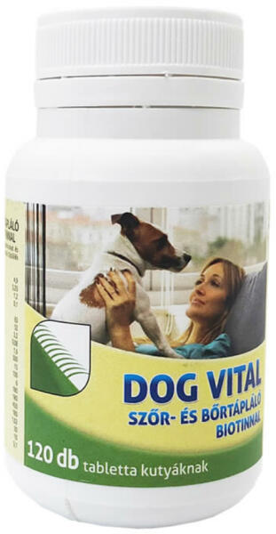 DOG VITAL Szőr- Bőrtápláló Tabletta Biotinnal javallata: A biotin bioaktív vegyület, aminek fontos szerepe van a szénhidrátok és zsírok anyagcseréjében és befolyásolja a bőr zsírtartalmát. Biotin hiány esetén a bőr szürkés, a szőr fénytelen lesz és a körmök töredezni kezdenek. Az optimális ellátás nélkülözhetetlen valamennyi korcsoportban és hozzájárul a bőr
