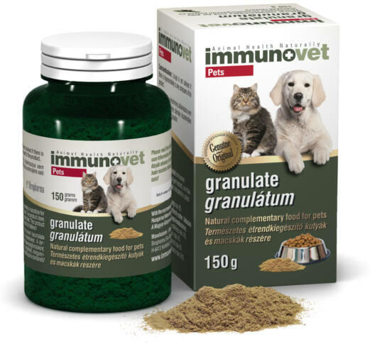 IMMUNOVET PETS Természet es étrend-kiegészítő granulátum kutyák és macskák részére 150 gramm Az Immunovet fermentált búzacsíra-kivonatot tartalmazó étrend-kiegészítő készítmény állatok részére. Klinikai vizsgálatok bizonyítják, hogy immunstimuláns, gyulladáscsökkentő és antioxidáns hatása révén az Immunovet segíti a kutyák és macskák egészségének megőrz