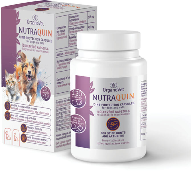 Mi az az Organovet NutraQuin? Az Organovet NutraQuin egy speciális takarmánykiegészítő, amelyet kutyák és macskák ízületi problémáinak kezelésére fejlesztettek ki. Különleges összetétele – köztük a Boswellia kivonat, glükozamin, kondroitin-szulfát és C-vitamin – támogatja az ízületek természetes gyulladáscsökkentő folyamatait és a porcok regenerálódását. Az e