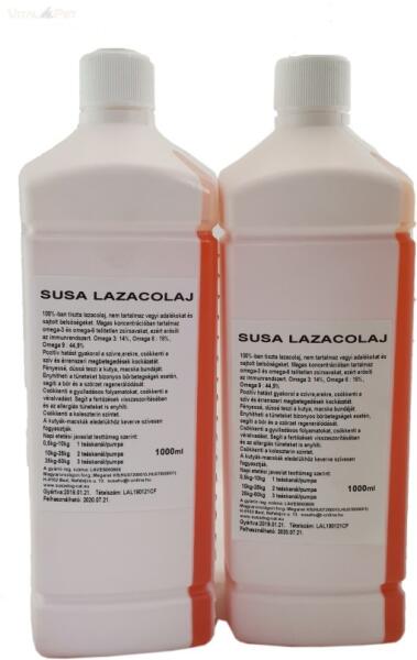 Susa Lazacolaj 1 liter – 100%-ban tiszta lazacolaj kutyák és macskák számára. Gazdag omega-3 és -6 zsírsavakban, erősíti az immunrendszert, javítja a szőrzet minőségét és támogatja az ízületeket. Susa Lazacolaj 1 liter – Egészség és szépség kedvenceidnek! A Susa Lazacolaj egy prémium minőségű, 100%-ban tiszta lazacolaj, amely kifejezetten kutyák és macskák számá