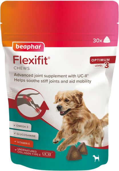 Beaphar Flexifit ízületvédő rágótabletták ízletes falatok bármilyen fajtájú kutya számára omega-3 és E-vitamin kiegészítéssel Tablettánként tartalmaznak 40 mg denaturálatlan II típusú kollagént UC-II ez segíti a fájdalmas ízületek támogatását Ez a lágy tabletta segít megőrizni az erős csontokat hozzájárul az ízületi ruganyossághoz a kutyák könnyed mozgásá