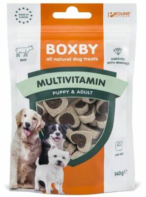 Boxby multivitamin snackek A Boxby multivitamin marhahúsból készül, vitaminokkal és ásványi anyagokkal dúsítva, hogy támogassa kutyája egészségét. Ez a jutalomfalat természetes, zsírszegény, kölyökkutyáknak és felnőtt kutyáknak egyaránt alkalmas, és kiválóan alkalmas edzésre és képzésre. A terméket 140 g-os, újra lezárható tasakba csomagolják. Összetétel: Gabo