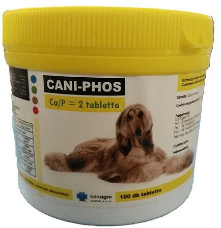 A Cani-Phos Ca/P 2 tabletta egy kalcium- és foszfortartalmú étrend-kiegészítő kutyák számára. Növekedésben lévő, vemhes és szoptatós kutyák számára ajánlott, melyek étrendje kiegyensúlyozott Ca/P-aránnyal rendelkezik Alkalmazás módja: Kiegyensúlyozatlan kalciumtartalmú eledelen tartott növendék kutyák és szoptató szukák táplálék kiegészítője. Jó ízének kös