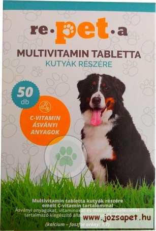 Re-pet-a multivitamin tabletta-kutya 50 db Repeta multivitamin tabletta-kutya 50 db multivitamin tabletta kutyák számára. A Repeta Multivitamin tabletta kutya részére modern elvek alapján kifejlesztett táplálékkiegészítő. Értékes, életfontosságú és magas biológiai értékű összetételével alkalmas kedvenceink optimális vitamin- és ásványi anyag szükségletének (makro-