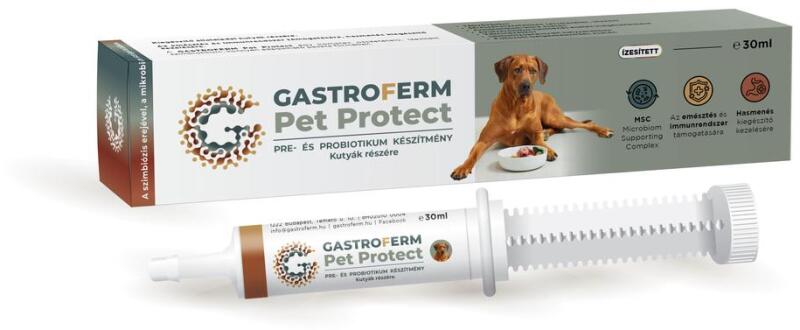 A védelem belülről kezdődik: támogassa kutyája egészségét a Gastroferm Pet Protect 30 ml komplex összetételű, ízesített szimbiotikum pasztával!A terméket 15 kg feletti kutyák részére ajánljuk!A könnyen adagolható, paszta formában elérhető készítmény prebiotikus összetételének köszönhetően támogatja az immunrendszer működését (Inulin, Fos, Mos, béta-glükán)