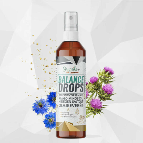 Máriatövismagolaj, tökmagolaj, feketeköménymag-olaj optimális elegye. Egy hatékony segítség az eledelek nedvesítésére és a szervezet további támogatására. Csak fújj rá 1-2 nyomásnyit az eledelre 100 grammonként és biztosan tapad a Humac® por! Grapoila Animeal Balance Drops kiváló minőségű hidegen sajtolt olajkeverék. Máriatövismagolaj, tökmagolaj, feketeköménymag-