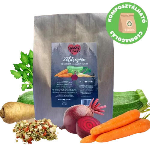 100% szárított zöldségmix (sárgarépa, paszternák, cékla, cukkini, zeller ) kiegészítő köret kutyád számára. Kiváló megoldás lehet állatorvos által előírt kizárásos diéta alkalmazásakor vagy BARF étrendet követőknek hús mellé kiegészítésként. 500 g szárított zöldség kb. 2 kg friss zöldséggel egyenértékű tápláléknak felel meg. 100% szárított zöldség