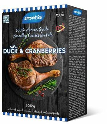 SMOOKIES Premium DUCK - kacsa keksz 100% emberi minőségű, 200g, smookies keksz kacsával és áfonyávalkeksz kutyáknak 100%-ban emberi minőségű összetevőkbőletesse a kutya súlyának megfelelően az ajánlott napi kekszmennyiséget (lásd a fotót)csökkentse a napi adag mennyiségét ennek megfelelőenösszetevők:. minőségi liszt (búza, burgonya), természetes növényi zsír (marg