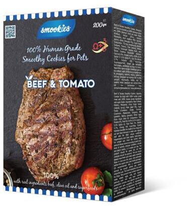 SMOOKIES Premium BEEF - marhahús keksz 100% emberi minőségű, 200g, smookies marhahúsos és paradicsomos kekszkutyáknak 100% emberi minőségű összetevőkkeletesse a kutya súlyának megfelelően az ajánlott napi kekszmennyiséget (lásd a fotót)csökkentse ennek megfelelően a napi adag mennyiségétösszetevők: . kiváló minőségű liszt (búza, burgonya), természetes növényi zsí
