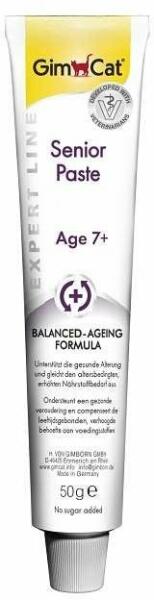 GimCat Senior Paszta 7+Kiegészítő állateledel idős macskáknak, segíti az egészséges öregedést ésbiztosítja az idősödő macskák tápanyag szükségletét. Felhasználási útmutató: Macskáknak 7 éves kortól adható. Napi 6 cm adhatóközvetlen a tubusból vagy az eledelre nyomva (1 cm = kb. 0,5 g). Szobahőmérsékleten etesse. Összetétel: növényi eredetű származékok, ola