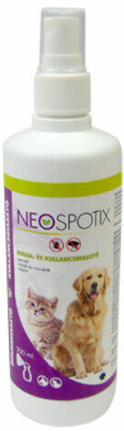 A Neospotix permet egy bolha- és kullancsriasztó hatással rendelkező készítmény. Fel használhatóság : Bolha- és kullancsriasztó hatás kifejtése kutya és macska testfelületén. Felhasználói kör : Lakossági felhasználásra. Célállatfaj : Kutya, macska Adagolás, alkalmazás, hatástartósság :Az állat testméretének megfelelő mennyiségű permettel 20-30 cm távolságból