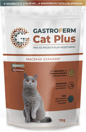 70g A Gastroferm Cat Plus ízesített szimbiotikum komplex összetételével segíti a macskák immun- és emésztőrendszerének megfelelő működését. A Gastroferm Cat Plus pre- és probiotikumokat tartalmaz, így kettős védelemmel gondoskodik a macskák egészségéről: támogatja a normál bélflórát és segít meggátolni a patogén baktériumok túlszaporodását. A hasmenés megszü