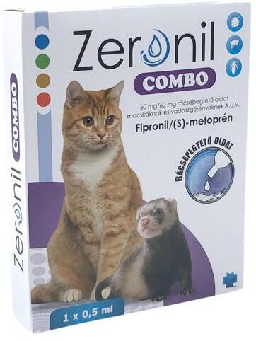 A Zeronil Combo rácsepegtető oldat bolha, kullancs és szőrtetvek okozta fertőzések kezelésére szolgáló készítmény. Használati utasítás Zeronil Combo 50 mg/60 mg rácsepegtető oldat macskáknak és vadászgörényeknek A. U. V. HATÓANYAGOK ÉS EGYÉB ÖSSZETEVŐK MEGNEVEZÉSE Rácsepegtet ő oldat. Tiszta, borostyán színű oldat. Egy 0,5 ml-es pipetta tartalmaz:- Hatóanyagok: F