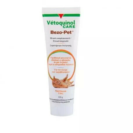 A Bezo-Pet szőroldó paszta a szőrbezoárok (szőrcsomók) eltávolítására és megelőzésére szolgáló táplálék-kiegészítő paszta macskák számára. Összetétel: Víz, speciális növényi olajok és zsírok, gabona, cukor Beltartalom:Nyerszsír: 23,4 %, Nyershamu: 1,5 %, Nyersfehérje: 0,8 %, Nyersrost: 0 % - A Bezo-Pet olajtartalmú paszta, a gyomorban keletkező szőrbezoárokat