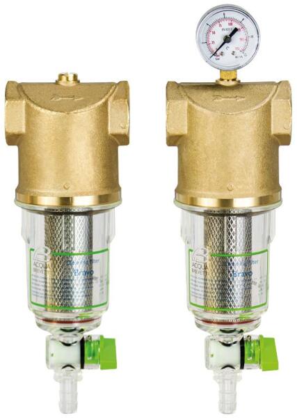 Acqua Brevetti Bravo vízszűrő 1" Acqua Brevetti Bravo vízszűrő 1" Kis méretű mechanikus előszűrő Leeresztő szeleppel JELLEMZŐKA Bravo egy kis méretű mechanikus előszűrő szennyeződésleeresztő szeleppel. A Bravo az EN 10226-1 és EN 228-1 szerinti menetekkel ellátott sárgaréz fejjel, Grilamid® (nagy szilárdságú poliamid) szűrőpohárral és beépített leeresztő csappal