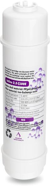 LS C100E vízlágyító szűrőbetét kationcserélő műgyanta töltettel. *A szűrőbetét kapacitása kb. 600 - 800 liter fordított ozmózis rendszerű víztisztító berendezések utószűrőjeként használva. Szűretlen, kemény csapvíz esetén a kapacitás drasztikusan csökken kb. 50 - 100 literre. Elhasználódás után telített sóoldatban többször újra regenerálható. Tehát így
