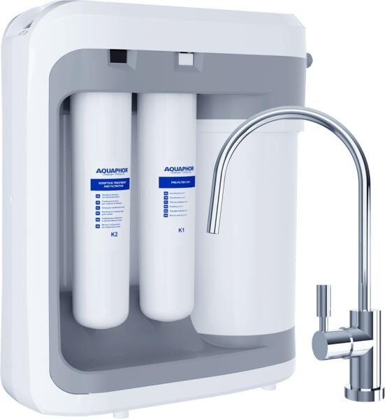 Intelligens és kompakt fordított ozmózis rendszer kettős membránnal, integrált szivattyúval és 5 liter tiszta víz tartállyal.