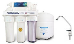 PurePro EC105-ECO5 lépcsős víztisztító berendezés, nyomógombos csappal. Ez a készülék csupán abban különbözik az EC105 készüléktől, hogy más típusú csaptelep van hozzá. A fordított ozmózis rendszerű víztisztító eltávolítja a vízből a lebegő szennyeződéseket (rozsda, homok, stb. ), a vízkövet, a klórt és származékait, a vegyszereket, nehézfémeket, nitráto