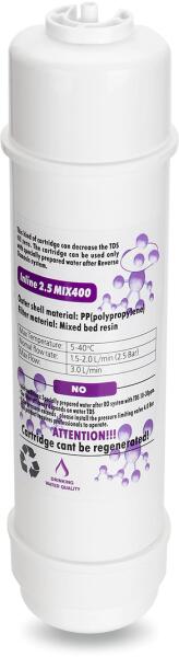 LS MIX400 vízlágyító - sótalanító szűrőbetét kevertágyas műgyanta töltettel. Használni akkor érdemes, ha fordított ozmózis rendszer által termelt tisztított víz keménységét és vezetőképességét szeretnénk a szinte 0 közeli értékre csökkenteni. A MIX400-as műgyanta által kezelt RO víz TDS értéke 0 ppm, vezetőképessége, pedig kisebb, mint 0,1 S/cm lesz. *A sz