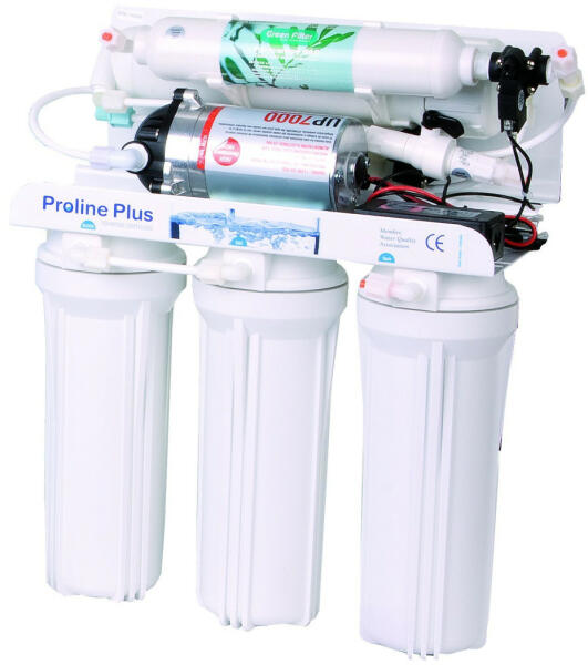 Proline Plus 5 lépcsős fordított ozmózis víztisztító, kombinált szén-ásványi anyag utószűrővel és nyomásfokozó pumpával OTH engedélyszáma: 880-1/2021/KTEF Ez a készülék el van látva egy nyomásfokozó pumpával. Akkor érdemes választania ezt a változatot, ha az Ön lakhelyén a hálózati víz nyomása nem éri el a 3 bar nyomást, mivel ez a víztisztító elő tudja á