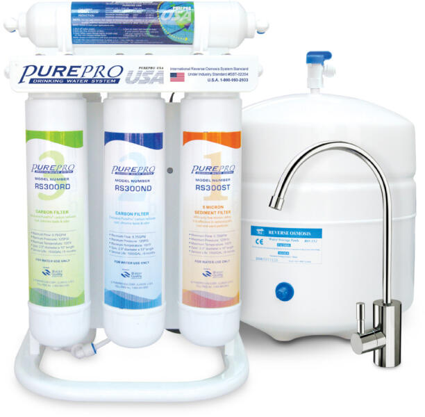A PurePro ERS105P háztartási RO (Reverse Osmosis - fordított ozmózis) víztisztító konyhai mosogató alá, a vízhálózatra szerelhető, 5 lépcsős, ivóvíztisztító berendezés nyomásfokozó szivattyúval. A PurePro RO105P (EC105P) háztartási víztisztító, modern, változat A PurePro ?ERS105P háztartási RO (Reverse Osmosis - fordított ozmózis) víztisztító konyhai mosogató a