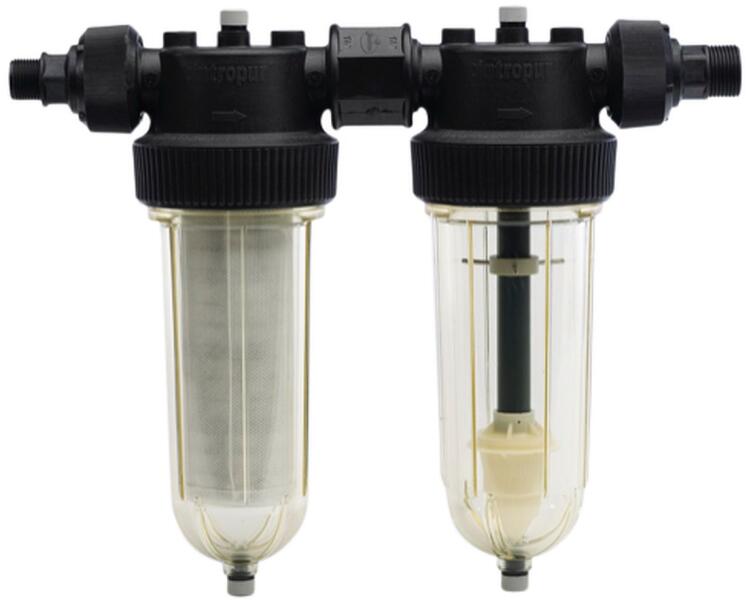 NW25 DUO vízszűrő jellemzői: ¾ colos és 1 colos csatlakozás, 0,5 m3/h átfolyás, szűrőház térfogata: 2*0.85 dm3. Kettős vízszűrő a háztartásban, felszálló csővel az aktív szénhez, polifoszfátokhoz, szilikátokhoz vagy szilikofoszfátokhoz és hüvelyhez.