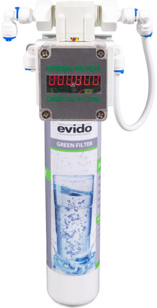 EVIDO GREEN FILTER ivóvíz utótisztító kisberendezés Szűrőházba épített, kompakt ezüstözött szénszűrő IP 65 védettségű (vízálló) digitális átfolyásmérővel. Eltávolítja a vezetékes vízből a kellemetlen szín-, íz és illatanyagokat, kiszűri a klórt, ólmot, vasat, mangánt (miközben a természetes ásványi anyagok megmaradnak). Ezüst töltete gátolja a baktér