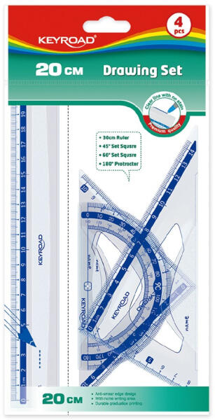 VONALZÓ KÉSZLET 20CM 4DB/BLISZTER KEYROAD Klasszikus egy kis modern beütéssel! készlet tartalma: 20 cm-es vonalzó, szögmérő, derékszögű vonalzó, 60°vonalzó műanyag, könnyű, könnyen hordozható átlátszó, amely lehetővé teszi a pontosabb mérést 4 db/bliszter