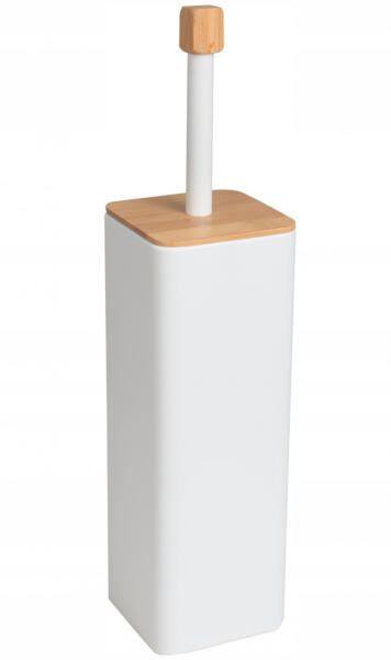 Praktikus loft stílusú WC-kefe. A fedéllel és a fogantyúval ellátott tartály kiváló minőségű, fehér festett acélból készül, bambuszfa fedő résszel. A kefetartó belsejében van egy kisebb eltávolítható csepegtető edény, amely szárazon és tisztán tartja a kefetartót. Teljes magasság: 40 cm Konténer magasság: 27 cm
